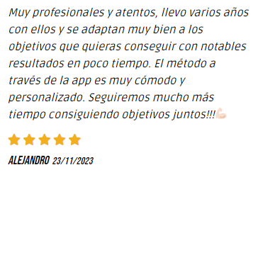 Dispondrás de un acceso 24h a nuestra APP móvil y podrás realizar todas las consultas necesarias: ver rutinas de entrenamiento, dieta, recetas, lista de la compra, chat para dudas, progreso de tu plan… ¡Siempre contigo cuando nos necesites!